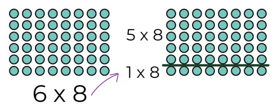 A second extremely helpful multiplication strategy that is made easier with arrays is what is often called the "break apart strategy." In this strategy, a child splits the array of an unknown fact into two arrays of known facts and then adds the products back together. For example, if a child doesn't know 6 x 8, but they do know their 5s and 1s facts, they could split 6 x 8 into (5 x 8) + (1 x 8) and add those two products (answers) together.