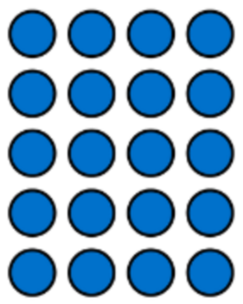For example, a child can look at this 5 by 4 array to see 5 groups of 4. They can solve this using repeated addition: 4 + 4 + 4 + 4 + 4 = ? which leads directly into understanding multiplication as combining repeated groups. 4 + 4 + 4 + 4 + 4 is the same as 5 groups of 4, which we can show as 5 x 4. Children often initially count by 4s five times to figure out the answer is 20.